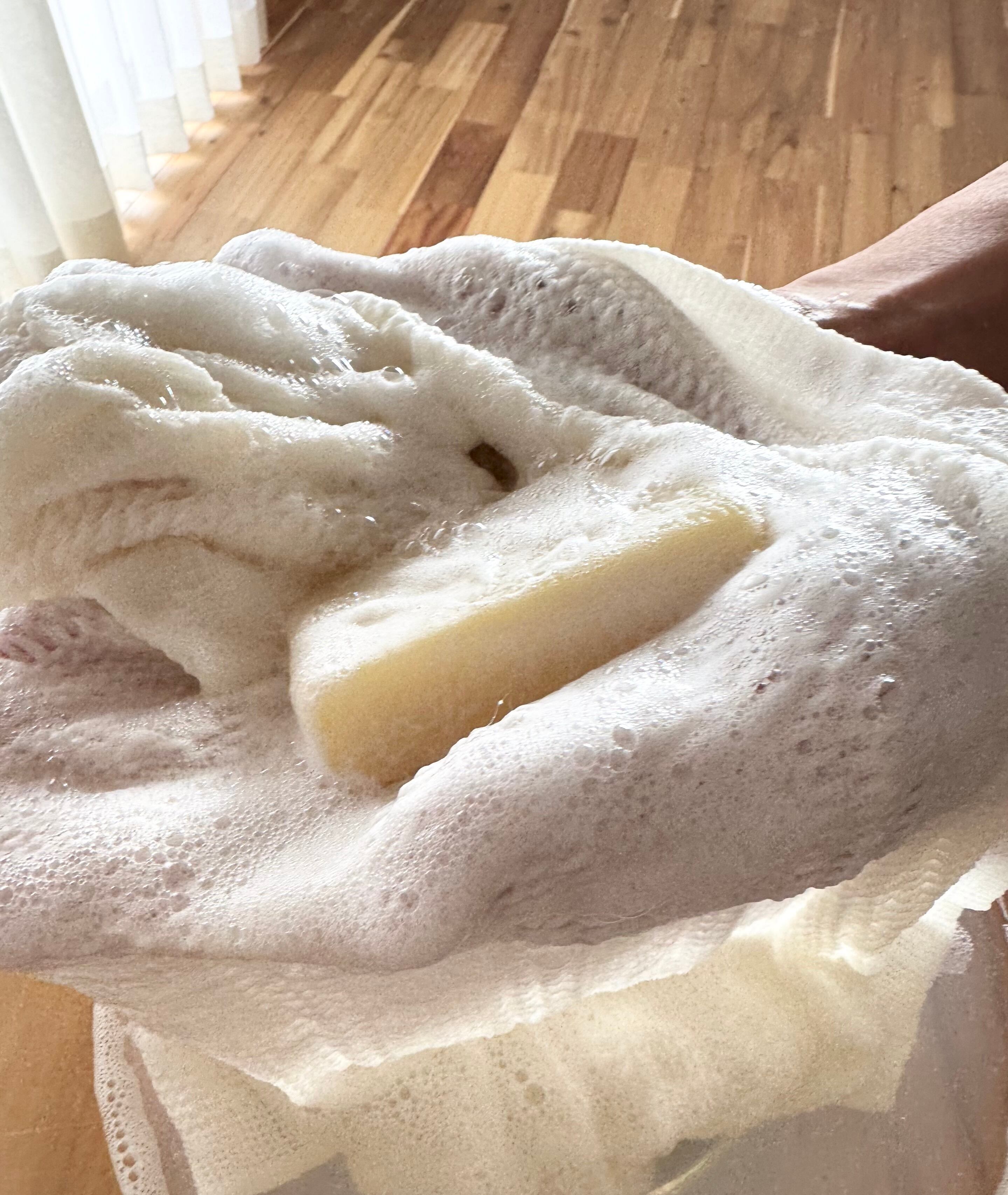 石鹸のクリーミーな泡立ちを引き出し、やさしく肌になじむことによって、お肌に摩擦によるダメージを軽減してくれます。
